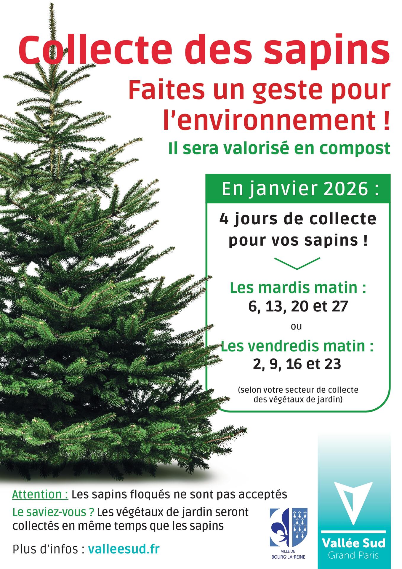 Cette opération se déroulera le matin, tout au long du mois de janvier, selon votre quartier (plus d'infos sur www.valleesud.fr) : les mardis matin 6, 13, 20 et 27 janvier ; ou les vendredis matin : 2, 9, 16 et 23 janvier. Les sapins devront être sortis la veille au soir ou avant 6h du matin et peuvent être laissés dans leur sac. En revanche, ils ne doivent être ni floqués, ni décorés, ni artificiels.